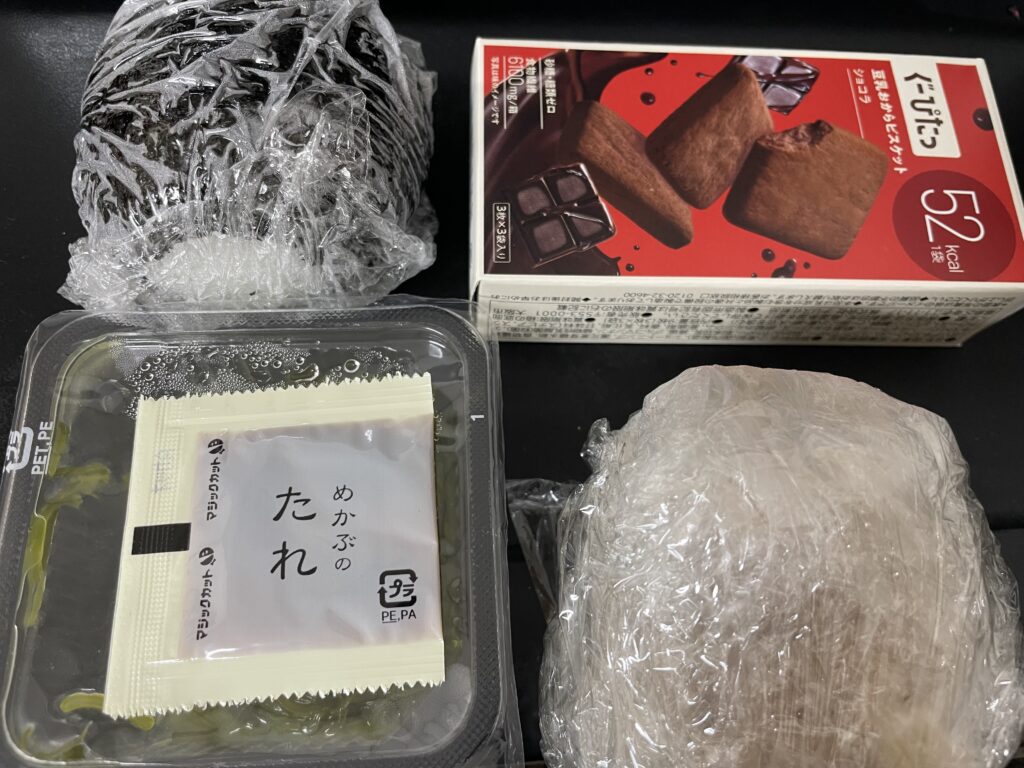 昼食:おにぎり150g(塩なし、ノリも塩なし、具はしゃけや鶏そぼろ昆布など)、鶏胸肉100g(塩茹で)、減塩味噌汁、めかぶ(タレが別になっているものを味噌汁に入れる)